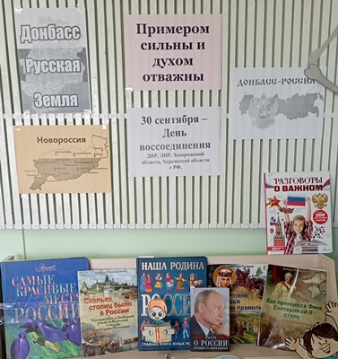 В акции участвовали читатели библиотеки. Библиотекарь рассказала о вхождении новых регионов в состав России. По результатам референдумов была восстановлена исто
