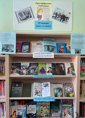 Книжная выставка посвящена Дню российского студента и Дню Татьяны. Здесь можно узнать о приметах, обычаях и традициях этого праздника. Выставка разделена на три части: 1. "Татьяна, милая Татьяна... Что написала ты для нас?" — книги, созданные Татьянами. 2. "Назови литературную Татьяну" — произведения, где главная героиня носит это имя. 3. "Задумайся о выборе профессии" — книги по профориентации. Книжная выставка "Мы помним город осажденный", посвященная освобождению г. Ленинграда от блокады, (6+)